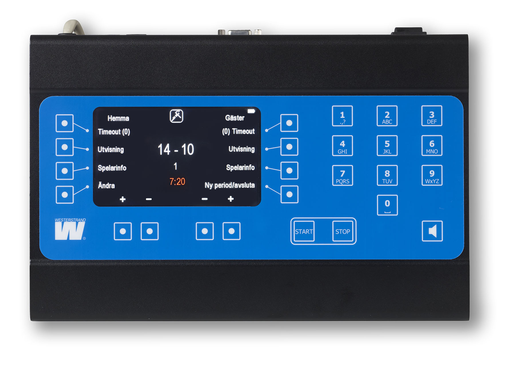 Remote unit with preprogrammed rules (international) for each sport. The TFT display adapts the control unit to the relevant sport and displays the same information as the scoreboard.