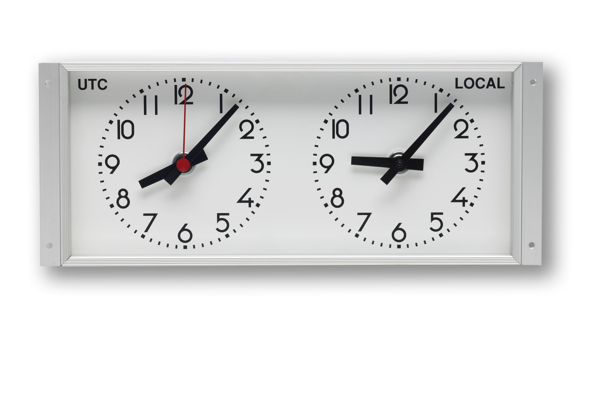 Analogue instrument clock with a housing in naturally oxidized aluminum designed for Marine installations. The clock has 2 faces with numerals that show both UTC and local time. With black hour and minute hands and a red second hand (only on UTC).