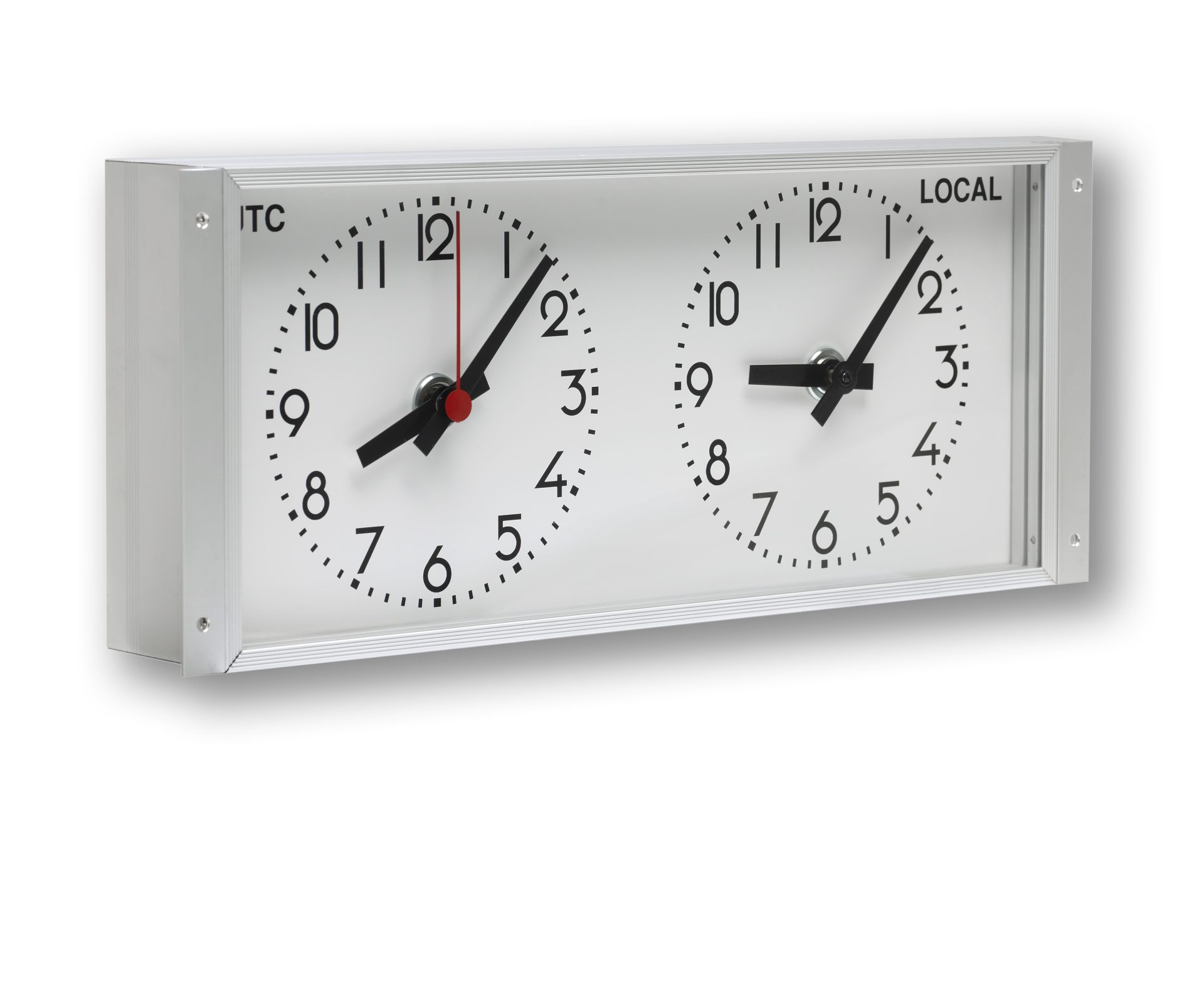 - Black hour and minute hands; red second hand (UTC).