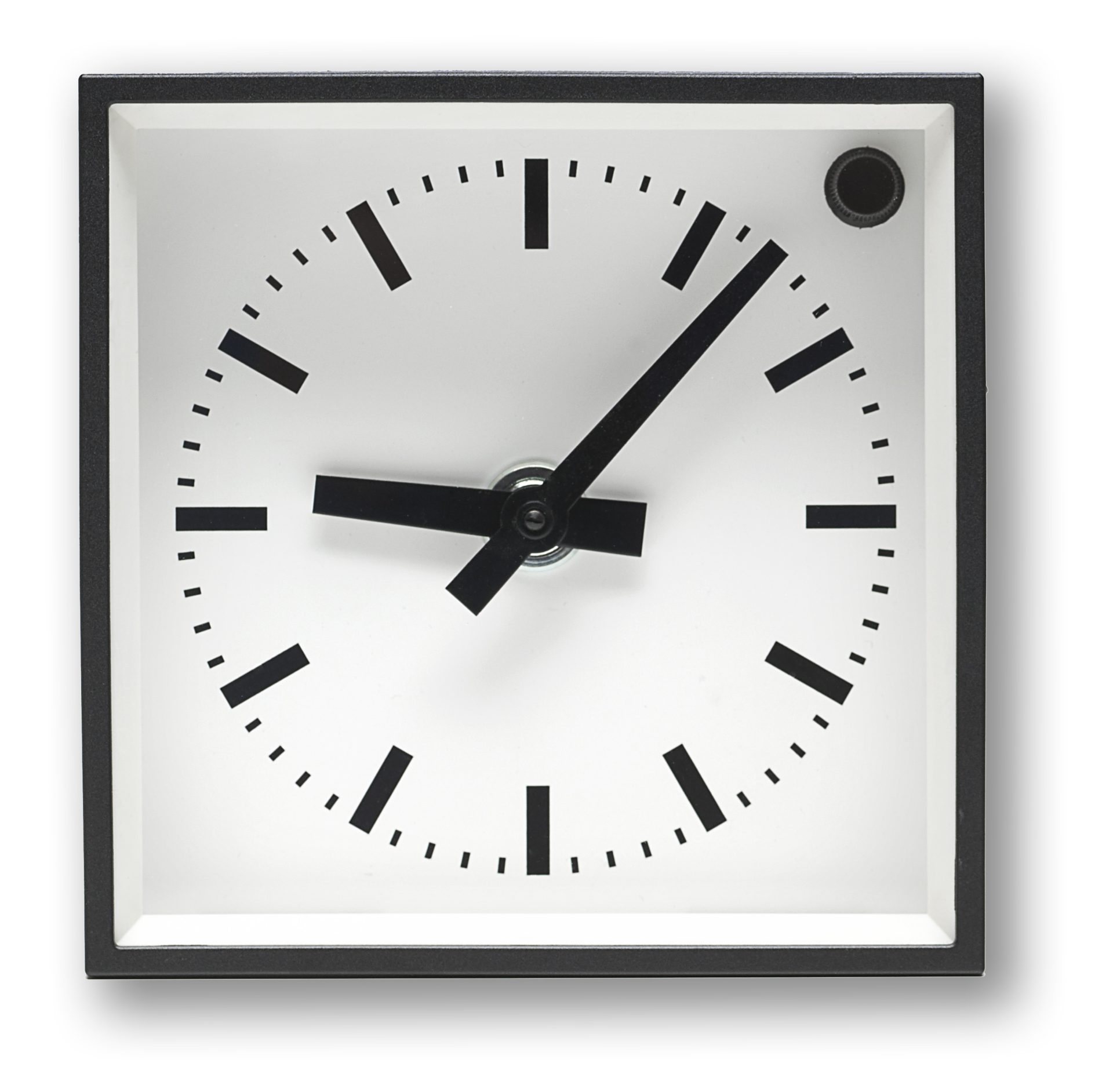 Analogue instrument clock with a black housing; designed for marine installations. Dial face with hour marks and hand in black. Red sweeping second hand available as an option.