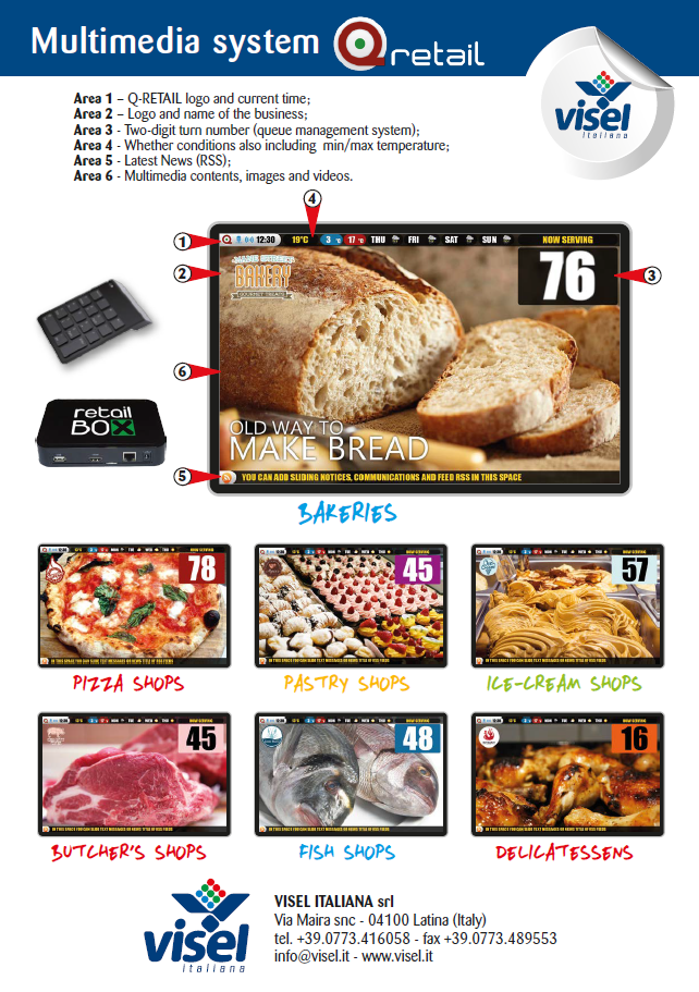 מערכת ניהול התורים החדשנית Q-RETAIL לחנויות ועסקים קמעונאיים. ככלל, מדובר באבולוציה משמעותית של מערכות לניהול שוק מסוג פשוט המסוגל לנהל, באמצעות מכשיר אחד, את מספר הסיבוב של הפצת התקשורת, ההצעות והמבצעים ללקוחות שמחכים.
