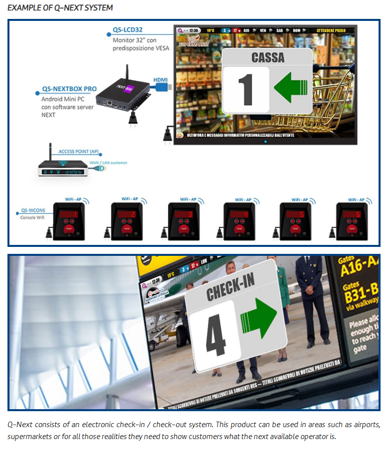 Q-Next מורכב ממערכת צ'ק-אין / צ'ק-אאוט אלקטרונית. ניתן להשתמש במוצר זה באזורים כגון שדות תעופה, סופרמרקטים או לכל המציאות הדרושה להם כדי להראות ללקוחות את העמדה הזמינה הבאה.